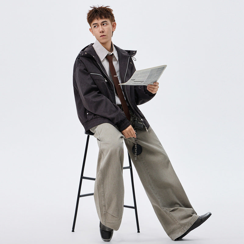 This is a versatile, relaxed-fit jacket featuring a full-length zipper and an adjustable hood. It has spacious front pockets and a clean, minimalist design, making it a functional outerwear piece.