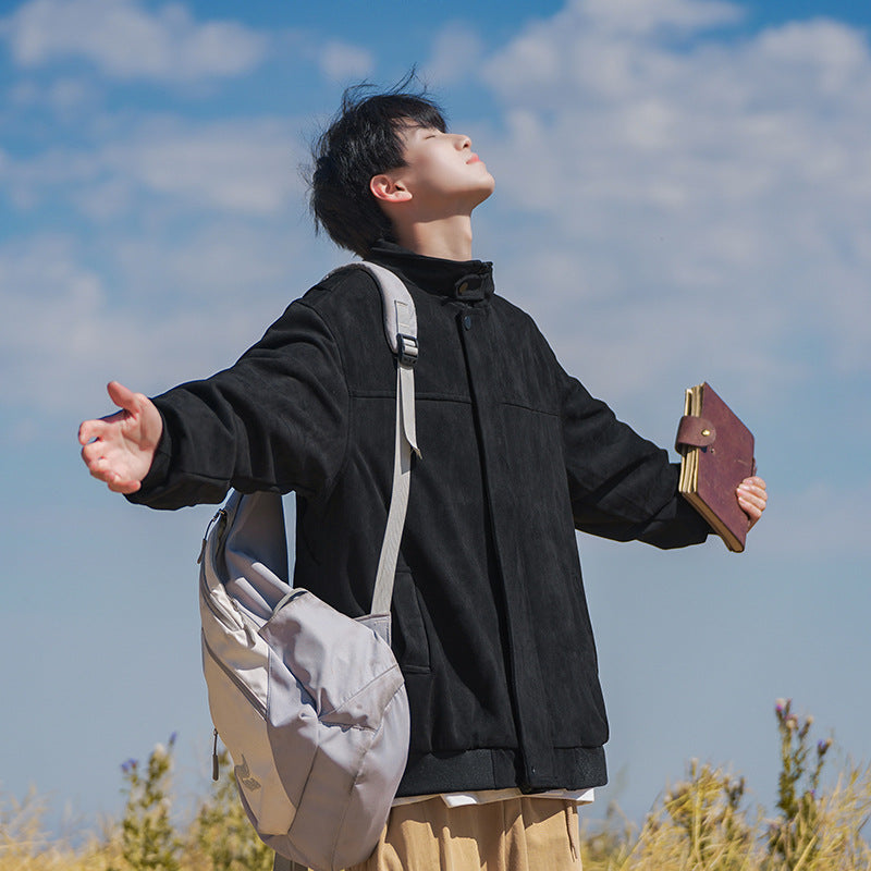 This jacket is a stylish and versatile outerwear piece designed for a relaxed, modern fit. It features a zip-up front with a buttoned placket and large front pockets, blending classic workwear aesthetics with contemporary style.