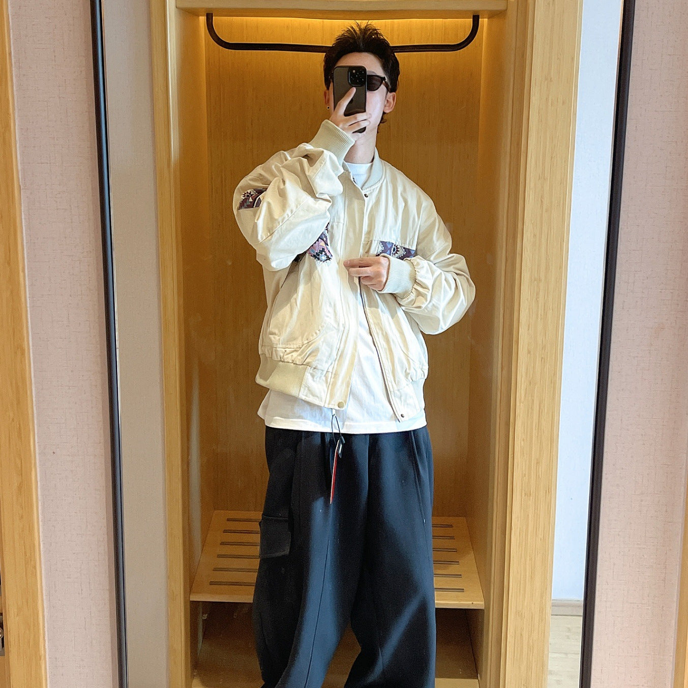 This is a stylish bomber jacket featuring a unique Aztec-inspired pattern on the sleeves and chest. It has a relaxed fit, a zip-up front, and ribbed cuffs and hem.