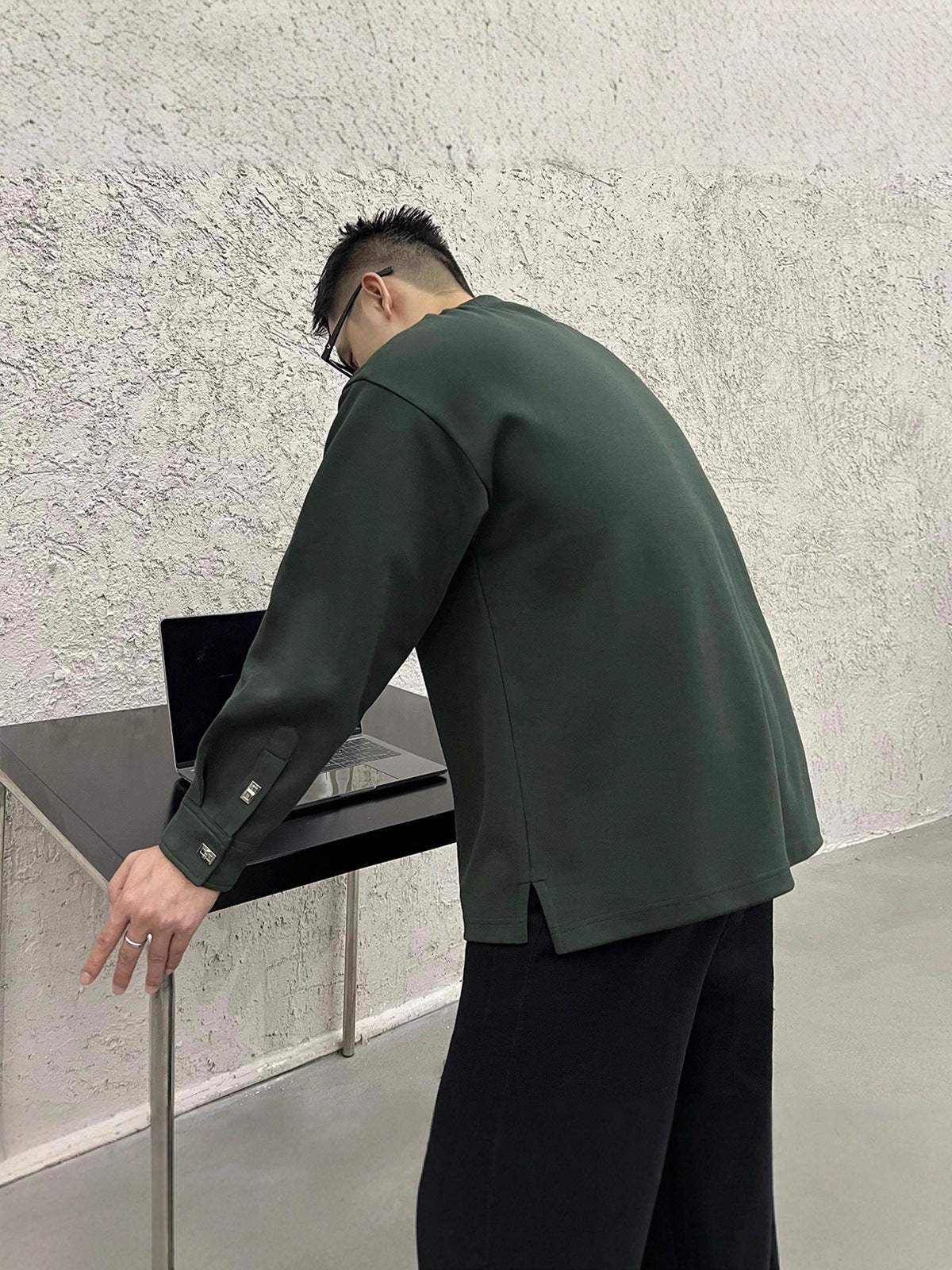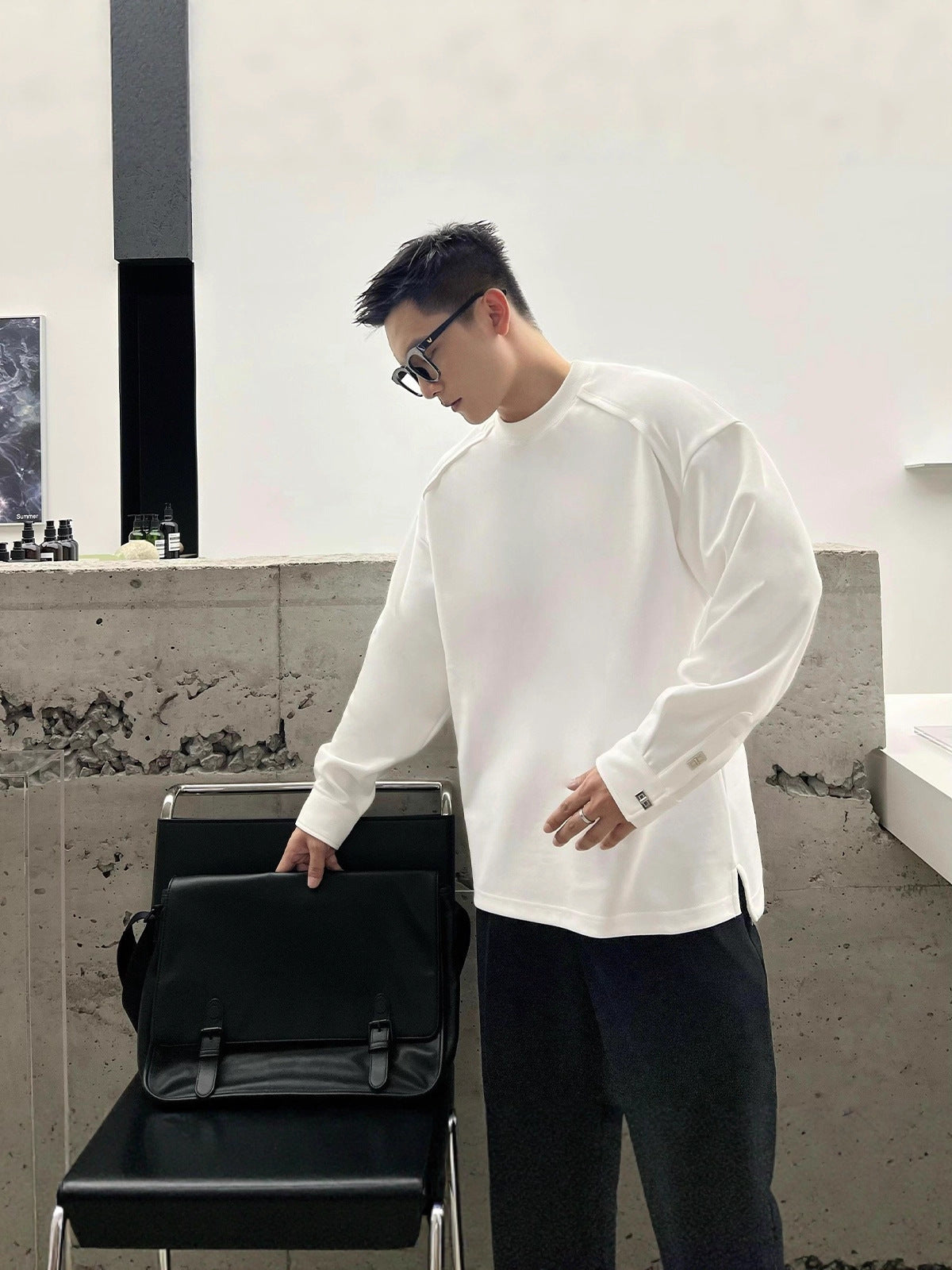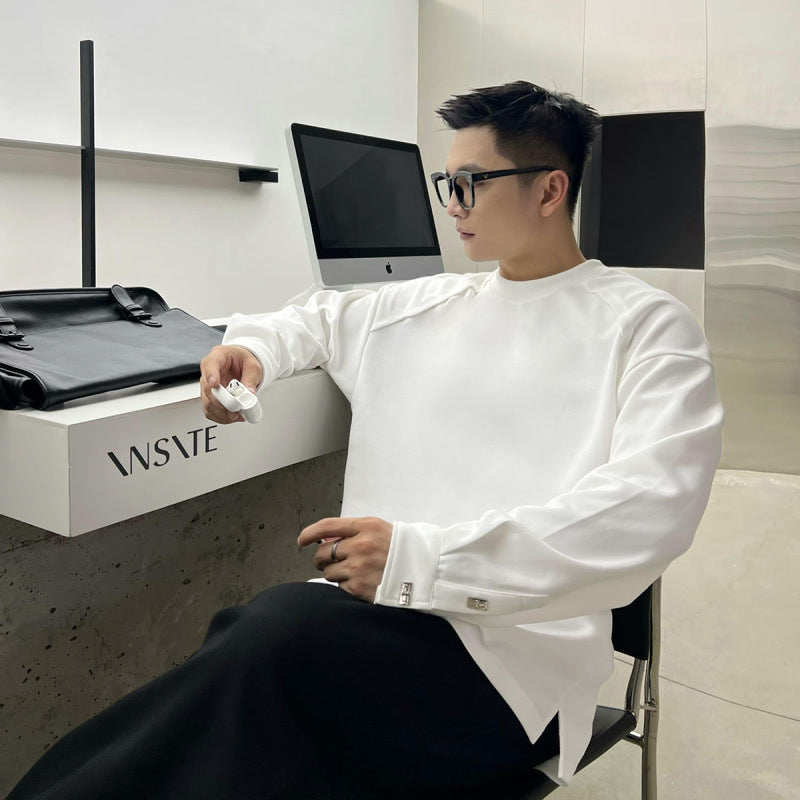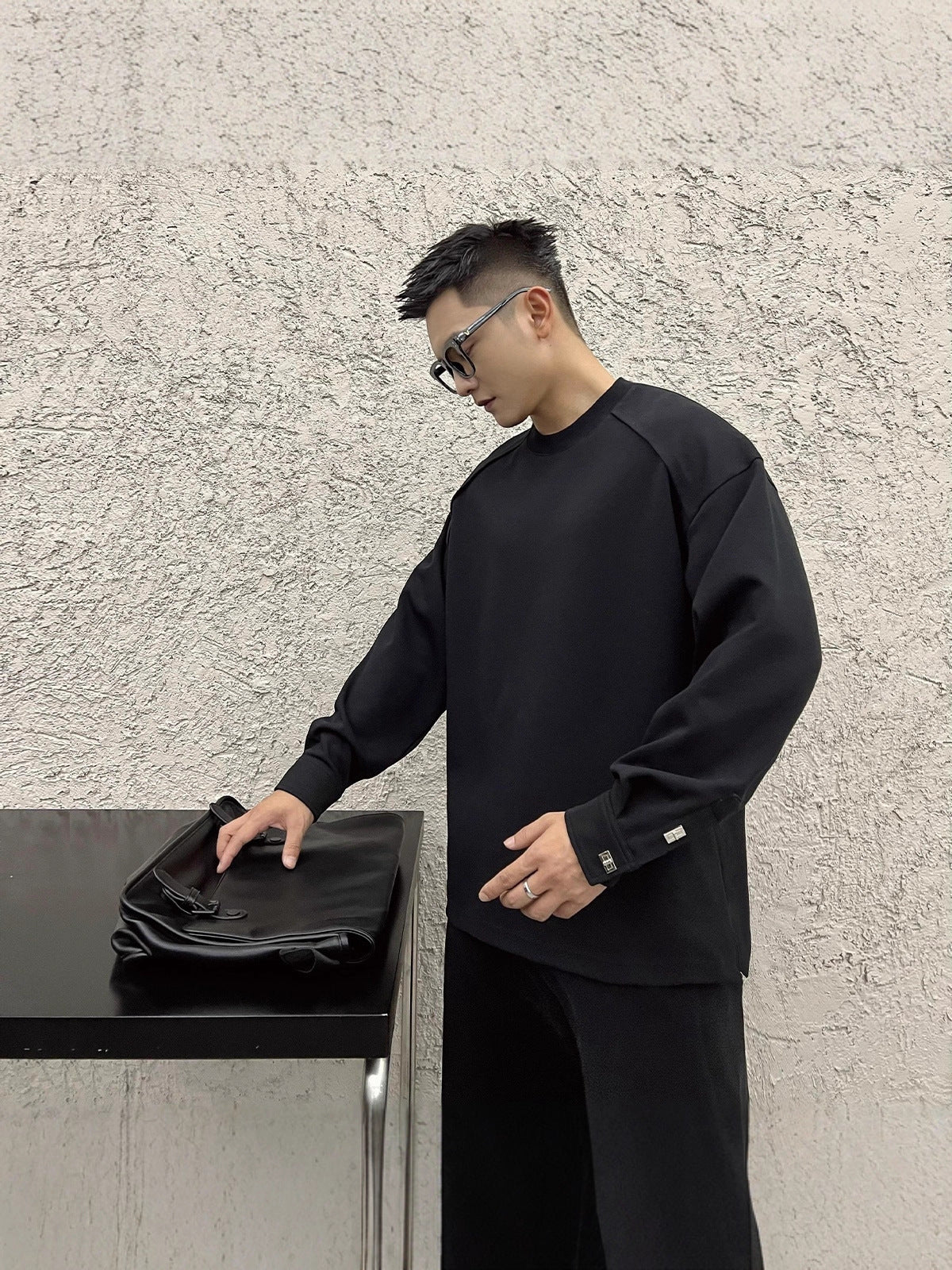 A wide-cut, drop-shoulder long-sleeve top featuring subtle buckle detailing on the cuff, offering a relaxed and modern silhouette.