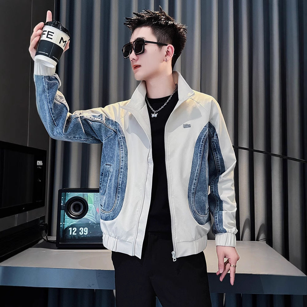 This jacket features a unique patchwork design, combining contrasting materials for a modern, layered look. It has a high collar, long sleeves, and a zip-up front, making it a versatile addition to any wardrobe.