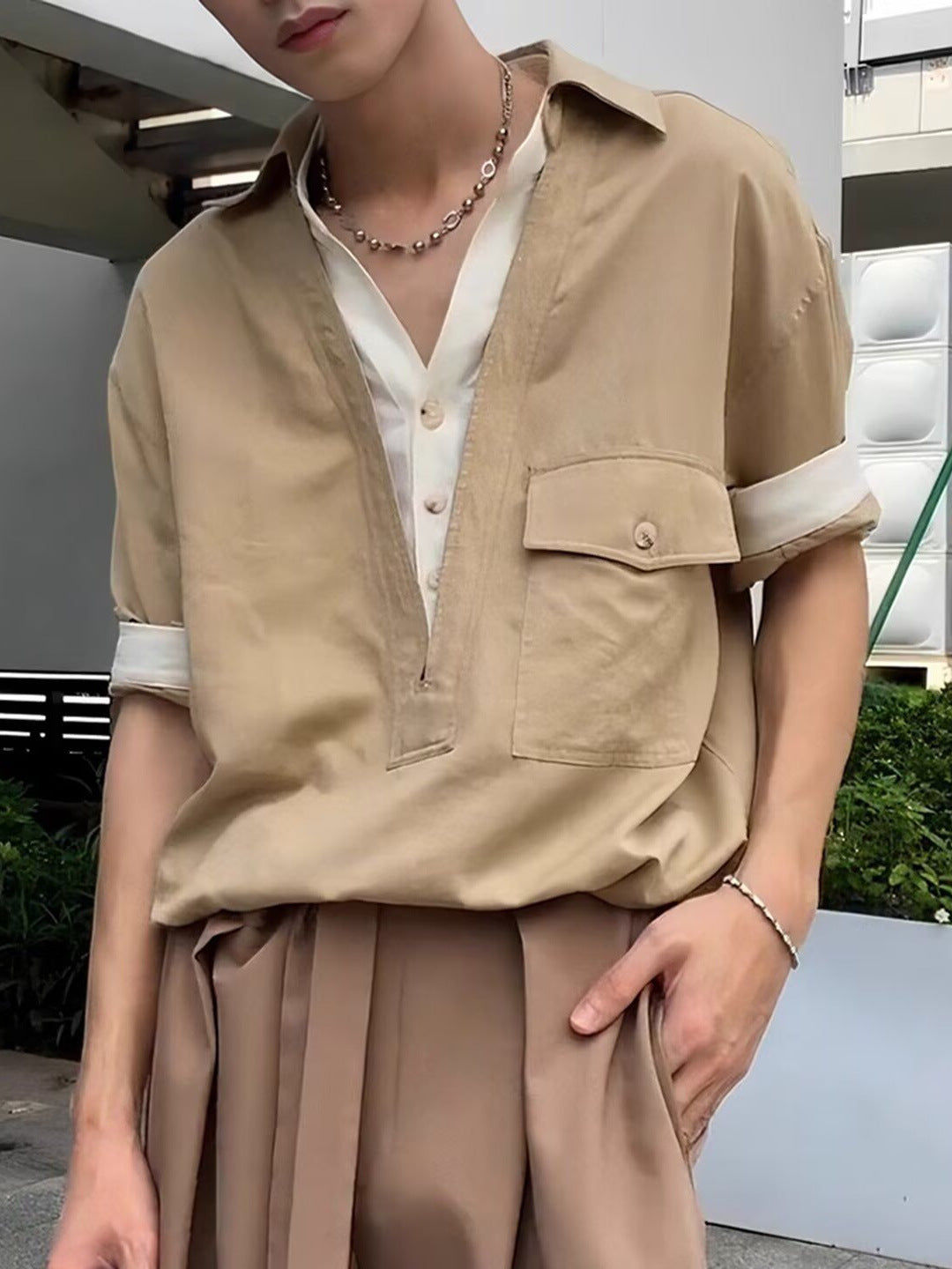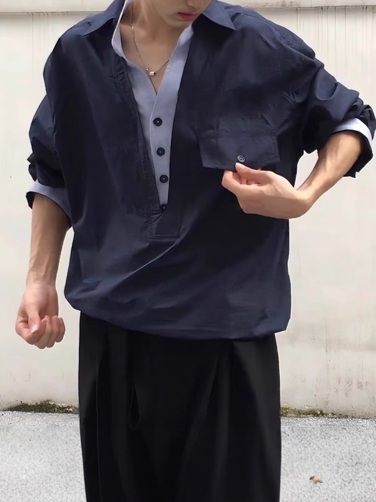 A trendy, loose-fitting faux two-piece design pullover shirt. It features a unique deep V-neck collar layered over a buttoned placket, giving a stylish, ready-made layered look. Its drapey, relaxed fit makes it a comfortable and casual top.