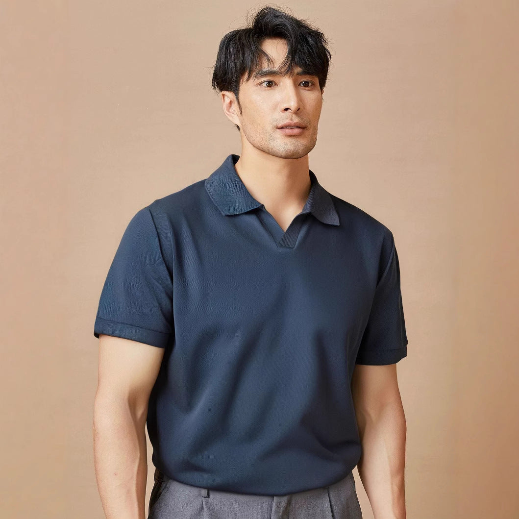 This is a stylish, textured polo shirt with short sleeves and a notched collar, offering a comfortable and versatile look.