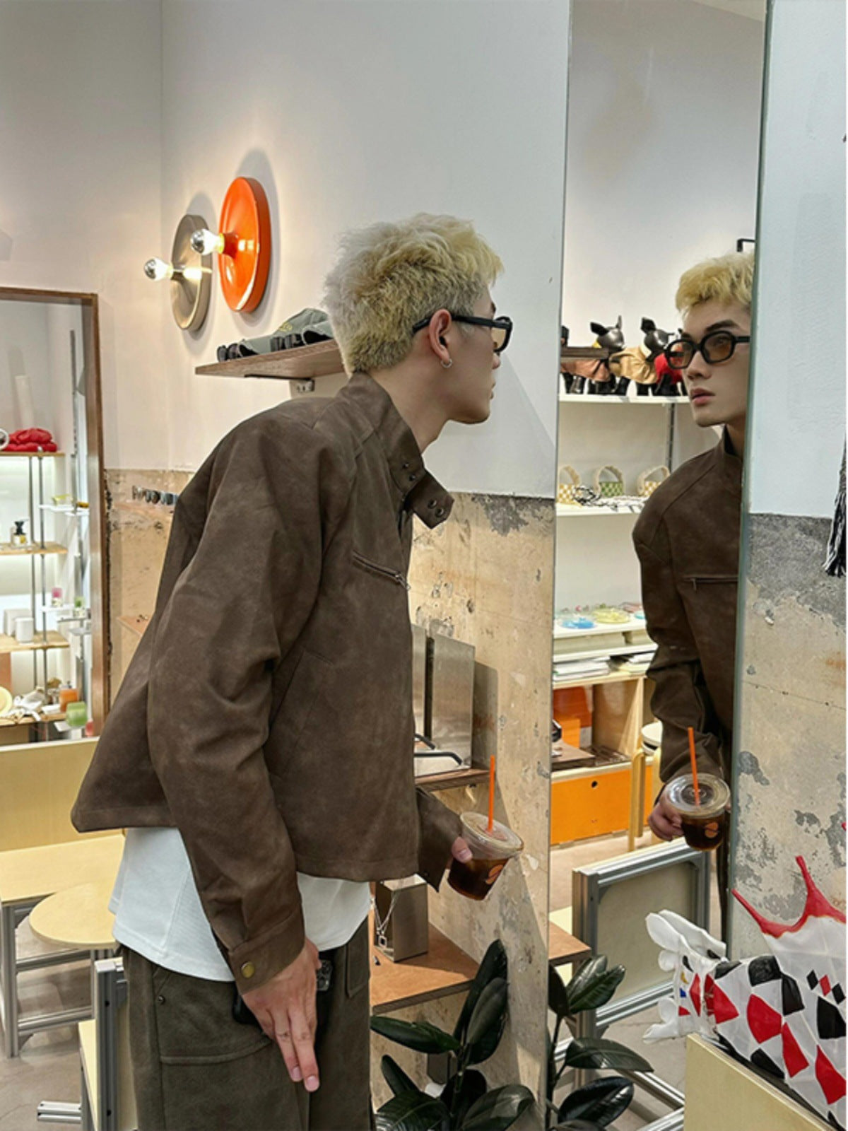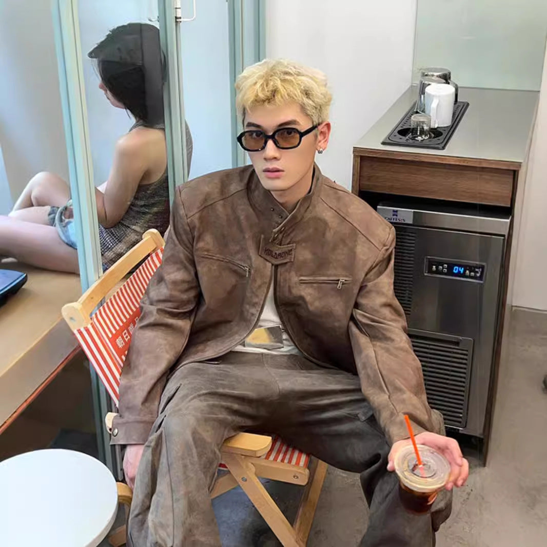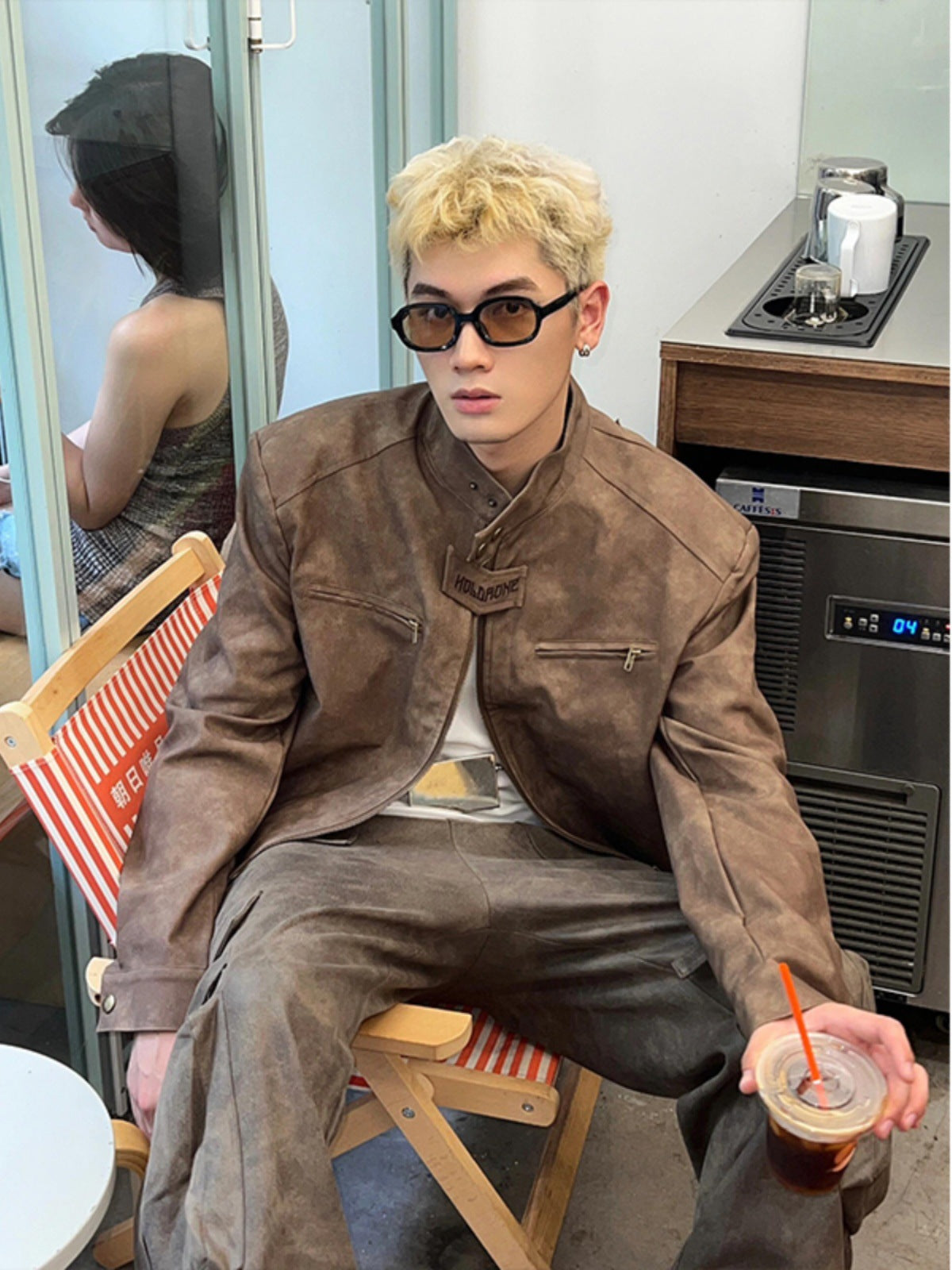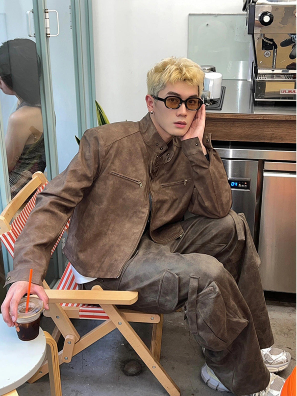 An elevated, distressed-look jacket featuring a mandarin collar and central button placket, paired with oversized, pleated cargo trousers. This coordinated ensemble offers a sophisticated, high-fashion aesthetic with a relaxed fit.
