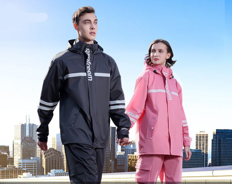 A two-piece set featuring a hooded, water-resistant jacket and coordinating pants, designed to provide coverage during outdoor activities.