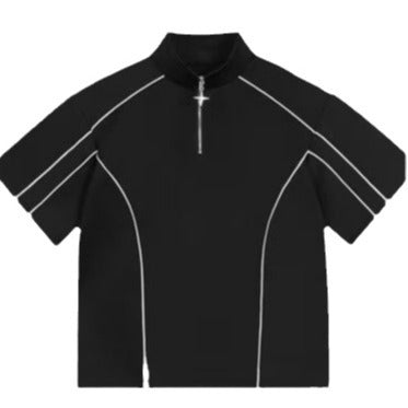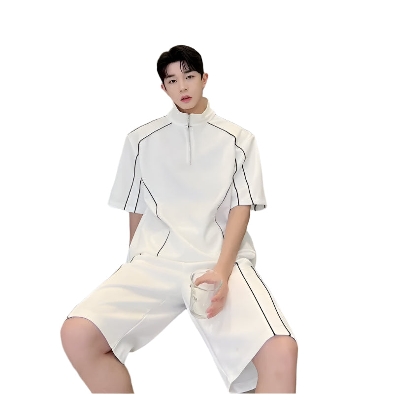 This set features a loose-fitting, half-zip top with matching shorts, designed for comfort and ease of movement.