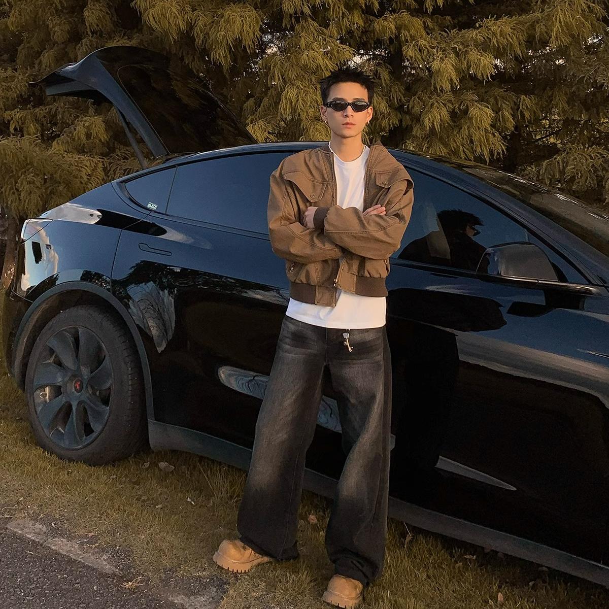 This is a stylish, oversized jacket with a relaxed fit. It features a classic bomber design with ribbed cuffs and a full zipper closure. It's a versatile outerwear piece suitable for a variety of casual looks.