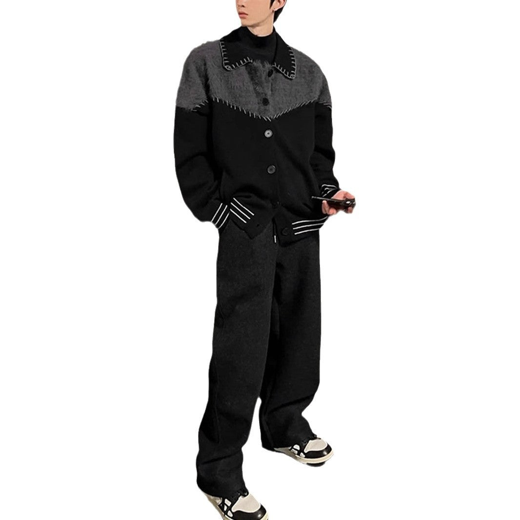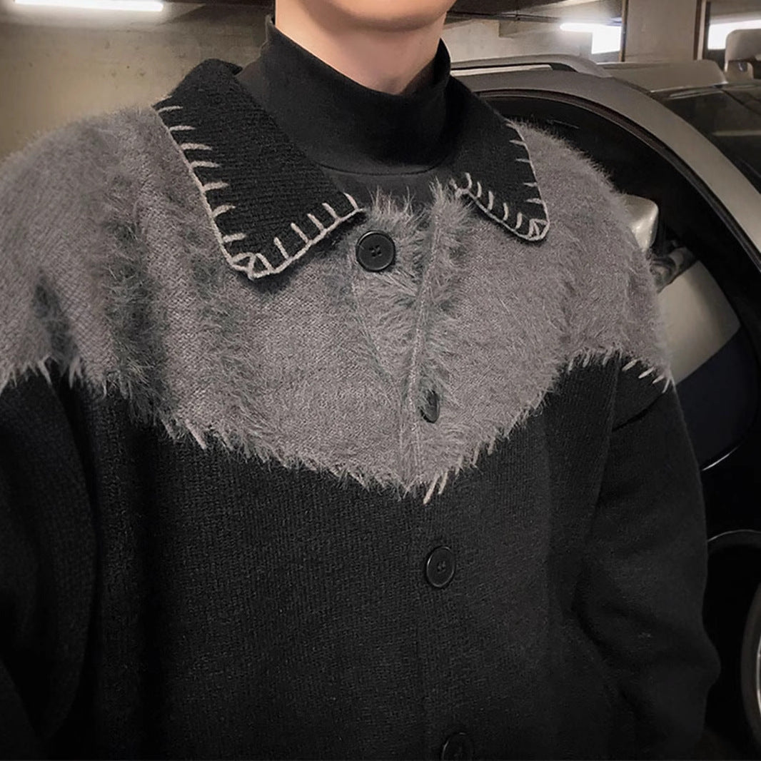 This is a stylish and cozy cardigan featuring a unique patchwork design. It combines a smooth knit fabric with a soft, shaggy texture for a modern, relaxed fit. The button-up front and ribbed cuffs provide a comfortable feel, making it a versatile addition to any wardrobe.