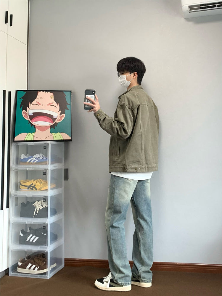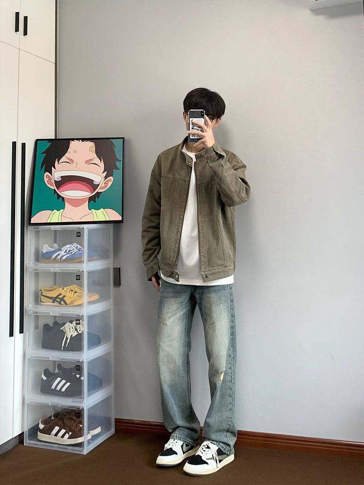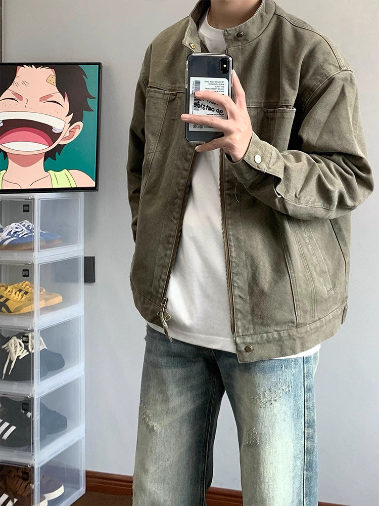 This stand-collar jacket features a durable, heavy-washed texture, offering a relaxed, oversized fit that's perfect for layering. Its design is inspired by vintage workwear, making it a versatile and effortlessly stylish piece for a contemporary casual wardrobe.