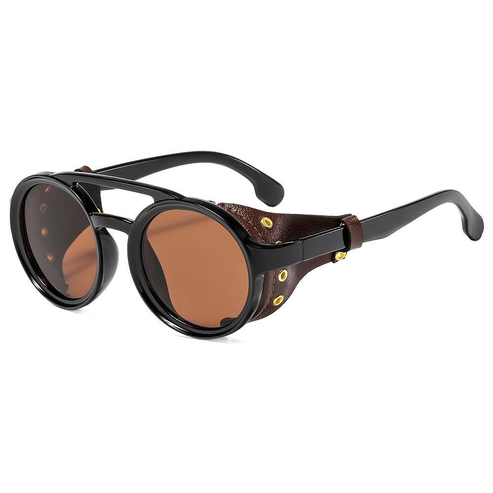 These unique sunglasses feature a double-lens design and leather side shields with rivet details, giving them a distinct industrial, vintage look. They offer a striking blend of style and practicality.