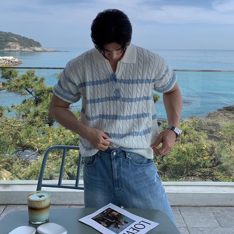 This knit polo features a relaxed fit with a textured weave and a subtle striped pattern. It's a stylish and comfortable piece that pairs well with jeans for a casual look.