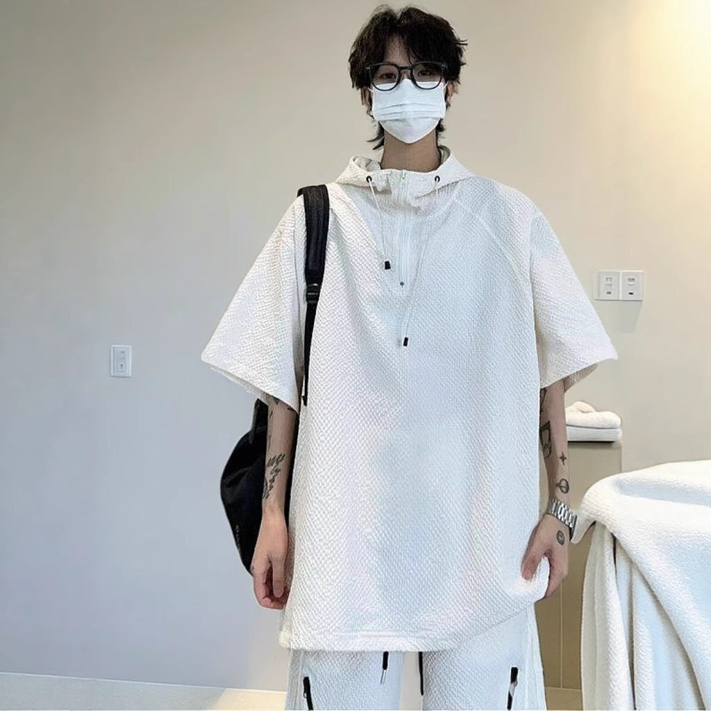 A versatile and modern ensemble, including a pullover hoodie with short sleeves and coordinating shorts with zippered pockets.