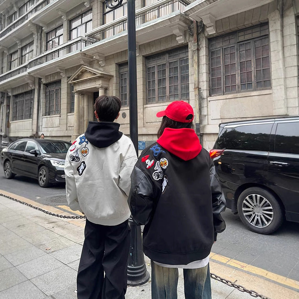 This is a stylish, oversized jacket featuring multiple embroidered patches, a button-up front, and ribbed cuffs. It has a relaxed fit, making it a versatile layering piece.