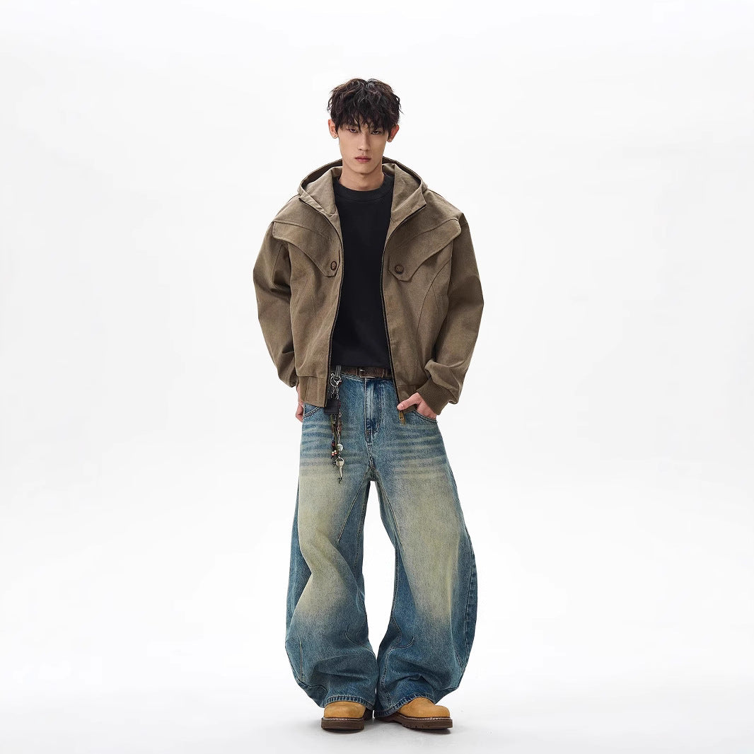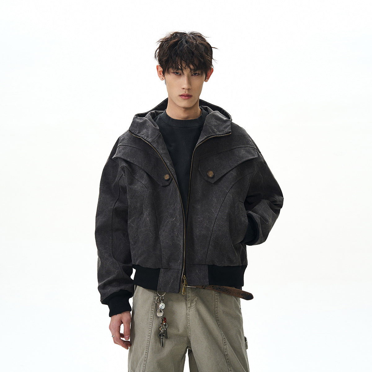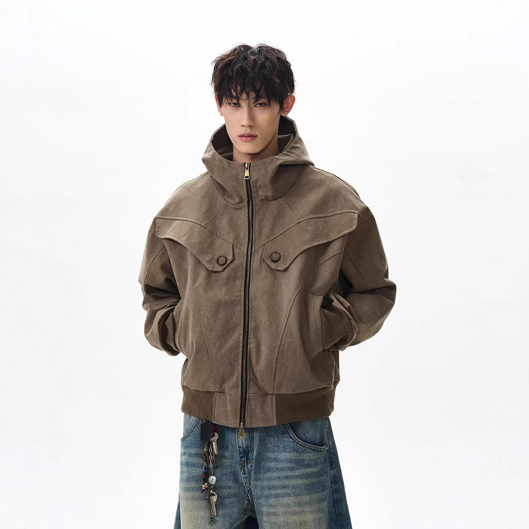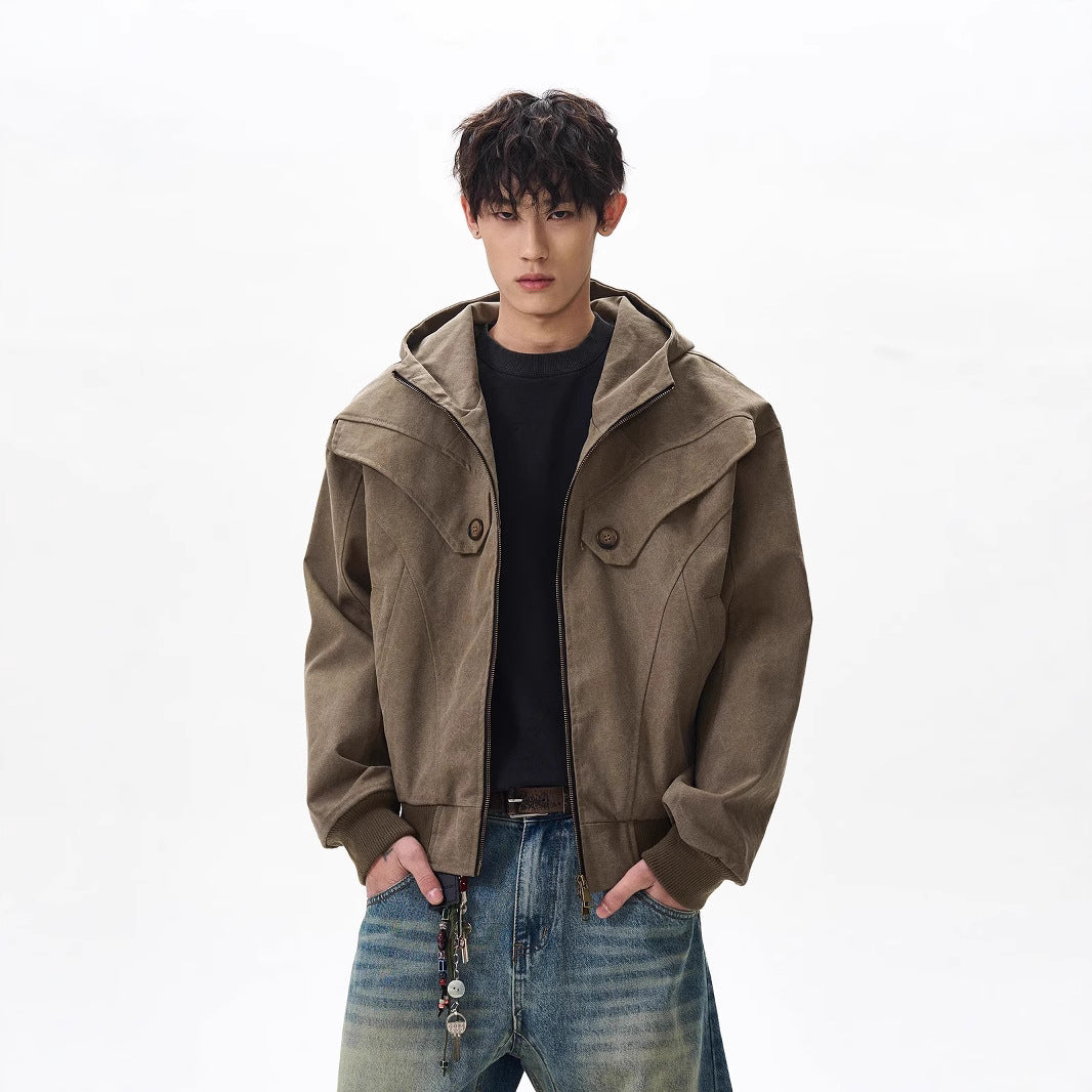 This is a cropped, boxy jacket featuring a unique, vintage-inspired design. It has a distinctive hood and exaggerated collar, with a casual, workwear aesthetic. The garment has a zip-up front and ribbed cuffs, with button details on the collar. The fit is loose and modern, making it a versatile layering piece.