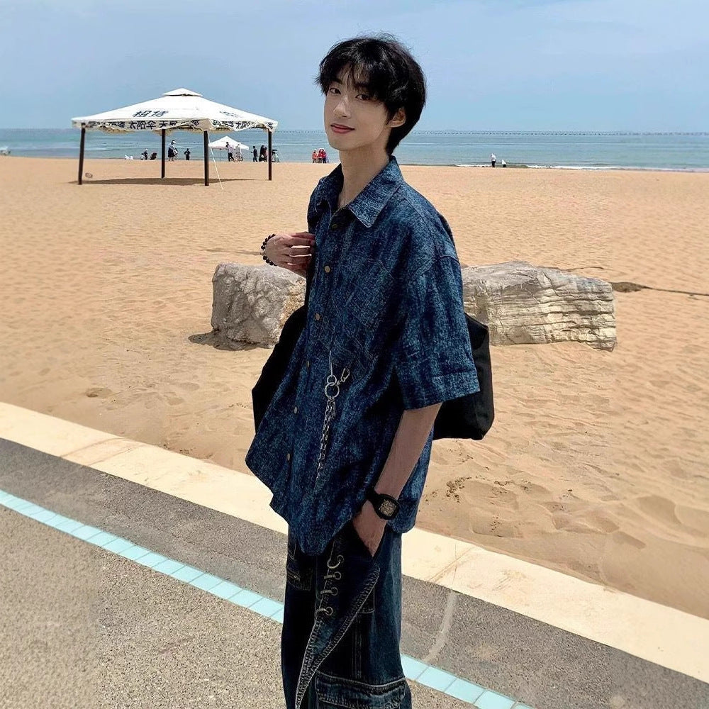 chic, tie-dye button-up shirt with a relaxed, oversized, short-sleeve cut. Its cool, high-fashion aesthetic is paired with a comfortable, loose fit for a modern, trending look.